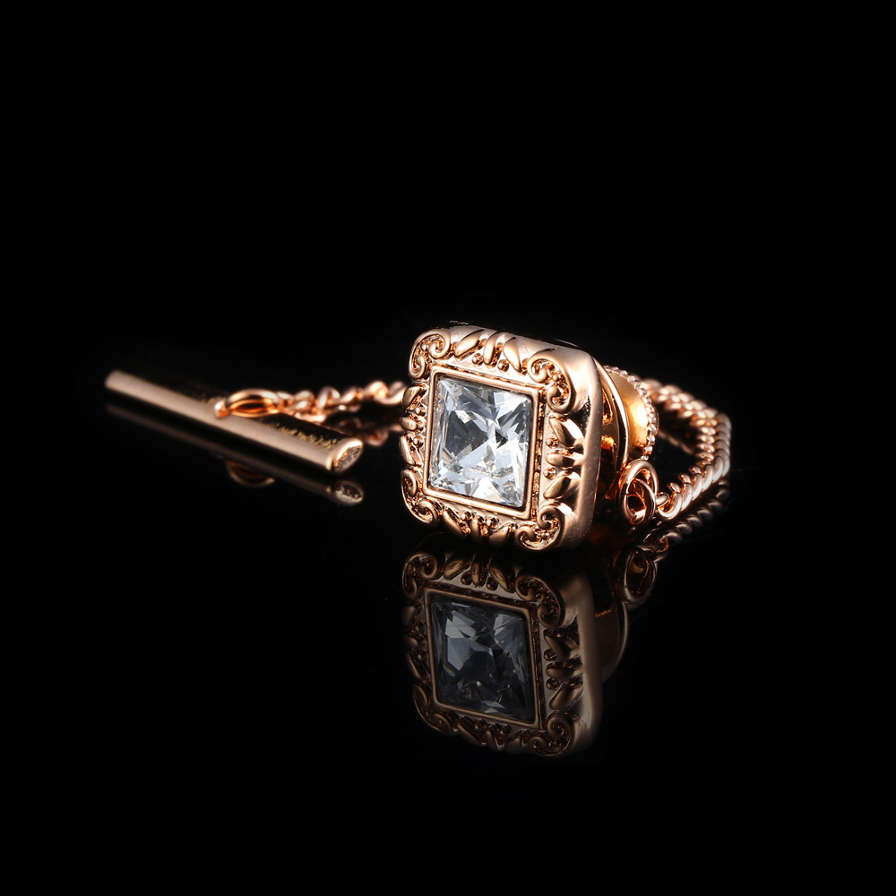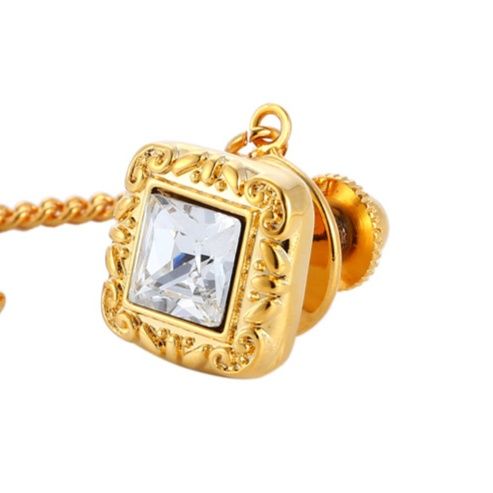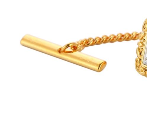 中央に透明な宝石を配した豪華な金のネクタイピンです。