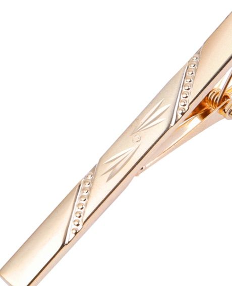 表面に繊細な放射状の彫刻と粒状の装飾を施した金のネクタイピンです。